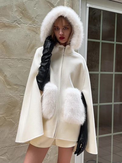 ふんわりと広がるマントシルエットに、ボリュームファーをあしらった存在感抜群のアウター。