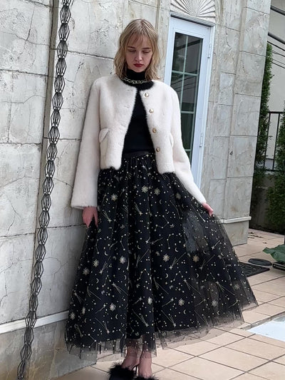 繊細なチュールに、EIMYオリジナルの星座刺繍を贅沢にあしらったロングスカート。